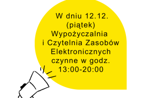 Informujemy, że 12 grudnia 2025 roku w związku z otwarciem wystawy z okazji 215-lecia powołania Biblioteki Medycznej, Wypożyczalnia i Czytelnia Zasobów Elektronicznych będą czynne w godz. 13:00 do 20:00.